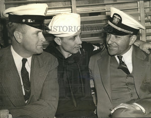 Sporting Navy Lt hats of the type they will weat are Jack Sisco lefft head football coach of North Texas Teachers College, Denton and Choo Sportsman right head track coach of same school. They are pictured at Dallas where they were sworn in Between the two is pharmacists mate first class HC Goldsmith whose brother Max is a star broad jumper of North Texass Sisco expeccted to be assigned to Naval Aviation Cadet seection board Sportsman is to go to Annapolis March 23 for training before assignment to physical training department of Naval Aviation