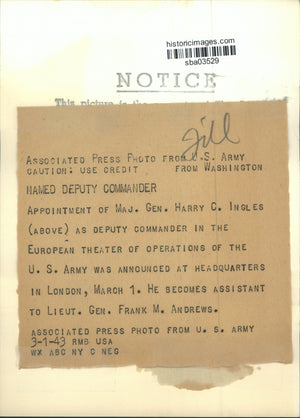 1943 Press Photo Maj Gen Harry C Ingles deputy Comdr in European theater