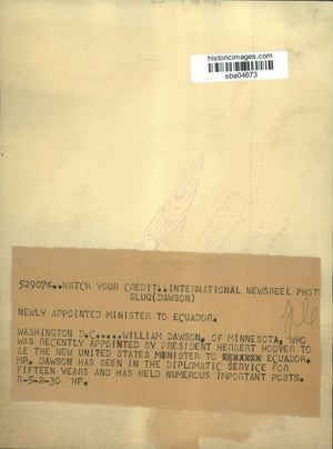 William Dason, of MN, who was recently appointed by Pres Hoover to be the U.S. Minister to Ecuador. Mr Dawson has been in the Diplomatic Service for 15 years and has held numerous important posts.