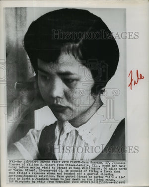 Haru Sueyama 27 Japanese fiance of William S Girard from Ottawa-LaSalle IL combs her hair before making a visit to Girard at Camp Whittington 60 miles north of Tokyo. Girard 22 year old GI is accused of firing a freak shot that killed a Japanese woman and touched off a quarrel clouding American-Japanese relations. Haru quoted Girard as saying its a lie that he lured a Japanese woman to her death on the firing range.