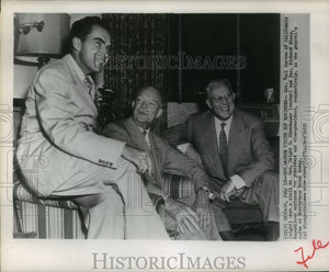 Gov. Earl Werren of California (right) pays visit to Gen. Dwight D. Eisenhower (center) and Sen. Richard Nixon, Republican nominee for President and Vice-President, respectively, in the General's suite at Blackstone Hotel.
