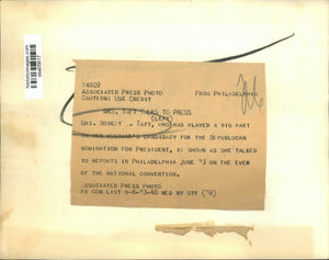 Mrs Robert A Taft who has played a big part in her husbands candidacy for the Republican nomination for President is shown as she talked to reporters in Philadelphia June 23 on the eve of the National Convention.