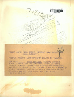 James Moffett, Federal Housing Administration and Mrs. Moffett, shown at Grand Central station, where they boarded the commodore Vanderbilt, crack flyer on the start of a 3 months vacation trip which will carry them around the world via the west coast and the orient.