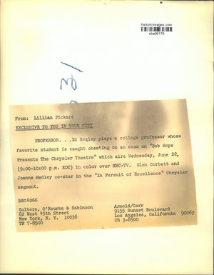 Ed Bagley plays a college professor whose favorite student is caught cheating on an exam on "Bob Hope Presents The Chrysler Theater" which airs Wednesday, June 22 (9:00-10:00 PM, EDT) in color over NBC-TV. Glen Corbett and Joanne Medley co star in the "In Pursuit of Excellence" Chrysler segment.