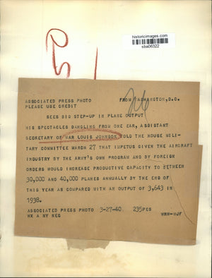 His spectacles dangling from one ear, assistant secretary of war Louis Johnson told the House Military Committee March 27 that impetus given the aircraft industry by the army's own program and by foreign orders would increase productive capacity to between 30,000 and 40,000 planes annually by the end of this year as compared with the output of 3,643 in 1938.