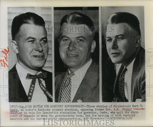 Three studies of 43 year old Bert T Combs in todays Kentucky primary election opposing former Gov AB Happy Chandler in race for Democratic nomination for Governor. Combs who quit the state court of appeals to make the governorship race has the backing of both Kentucky senators and the current state administration.
