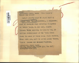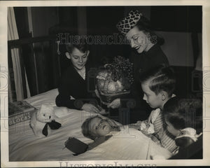 Ms Nana Gollner (C), a ballerina, visits Murray Glack, 2, (in bed) helpless from infantile paralysis. Gollner also visited Michael Reese Hospital in Chicago between performances at the Civic Opera House to cheer up these small polio victims. Other boys are LTR: James Gordon; George Meehan and Kerminen Fristron.