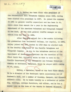 W.L. Holley has been first vice president of the Southwestern Bell Telephone Company since 1940, having been elected vice president in 1937. He joined the company in 1921 as general traffic supervisor and has been in St. Louis since then except for a year in the Engineering Department of the American Telephone and Telegraph Company in New York. He was made general traffic manager on his return from New York in 1928. After teaching school for a few months following his graduation from Occidental College, Los Angeles in 1909, Holley joined the Bell system in 1910 when he started work in the Traffic department of the Pacific Telephone and Telegraph Company. He was in the telephone section of the Department of Naval Communications for the duration of the first World War following which he went to work in the Traffic Department of the Chesapeake and Potomac Telephone Company at Baltimore, Maryland, where he stayed until coming to St. Louis. Holley, a bachelor lives at the Park Plaza Hotel. He is a director of the Municipal Opera Association and of Boatmen's Bank and a member of Noonday, Racquet and Missouri Athletic clubs. He is known locally as a collector of painting, etchings, antique furniture and silver and he has a summer home on the Lake of the Ozarks in Central Missouri.