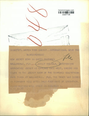 Billy Nichols, outstanding apprentice jockey at Chicago Race Meet, checks his silks in the jockey room of the reopened Gulfstream Park track at Hallandale, Florida. The track was closed in February 1939 after only four days of operation. First meeting will start December 1.