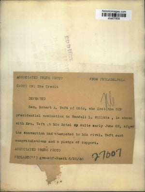 Senator Robert Taft of Ohio, who lost the GOP presidential nomination to Wendell L. Willkie, is show with Mrs. Taft at his hotel suit early June 28 after the convention had stampeded to his rival. Taft sent congratulations and a pledge of support.