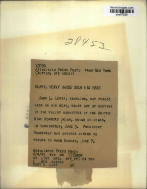 John L. Lewis , scowling, hat pushed back on his head, walks out of meeting of the Policy Committee of the United Mine Workers Union, which he heads in Washington, June 3. President Roosevelt has ordered miners to return to work Monday, June 7.