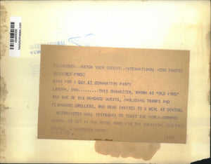London England This character known as Old Fred was one of 60 guests including tramps and flophouse dwellers who were invited to a meal at Central Westminster Hall yesterday to toast the newly crowned Queen To get in the royal mod for the occasion Old Fred donned a souvenir crown