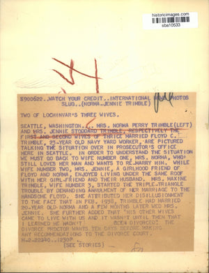 Mrs. Norma Perry Trimble and Mrs. Jennie Stoddard Trimble, respectively the first and second wives of thrice marries Floyd Trimble, 23 year old navy Yard worker, are pictured talking the situation over in prosecutor's office here in Seattle. In order to understand the situation we must go back to wife number one, Mrs. Norma, who still loves her man and wants to re marry him. While wife number two, Mrs. Jennie, a girlhood friend of Floyd and Norma, enjoyed living under the same roof with her girl friend and their husband. Mrs. Maxine Trimble, wife number three started the triple triangle trouble by demanding annulment of her marriage to the handsome Floyd. She attributed her disillusionment to the fact that in February 1938, Trimble had married 20 year old Norma and a few months later wed Mrs. Jennie, she further added that "his other wives came to live with us and it wasn't until then that I learned he hadn't been divorced." The Divorce Proctor wants ten days before making any recommendations t the divorce court.