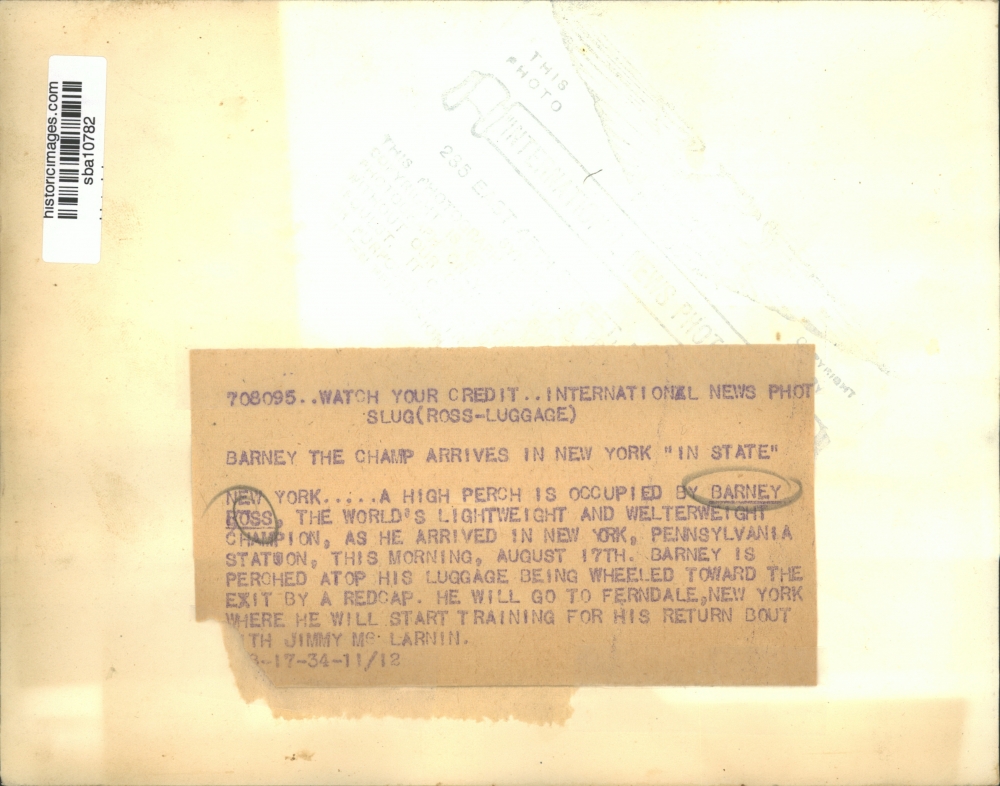 A high perch is occupied by Barney Ross, the world's lightweight and welterweight champion, as she arrived in New York, Pennsylvania Station, this mor