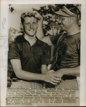 Sixteen-year-old Tommy Jacobs, Montebello, Calif., high school junior, has his hair mussed by his caddy, Eddie Reybitz, after Jacobs went into the semi-finals of the 1931 National Amateur Golf Tournament here today, He was the youngest ever to advance this far since 1904. Bobby Jones entered the tourney in 1916 at 14.