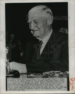 General Robert Wood, Chairman of the Sears Roebuck & Company finances committee wears a smile as he testifies today during the Senate Banking Committee study of the stock market and its 18th month old boom. Wood said the firm's profit sharing pension fund has 90 million dollars in cash which it won't invest for the present due to the uncertainty over market conditions. Today's stock prices may not be too high, he said, but on the other hand I don't want to risk my employee's money."