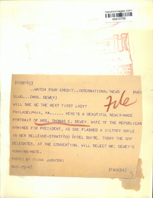 Here's a beautiful newly-made portrait of Mrs. Thomas E. Dewey, wife of the Republican nominee for President, as she flashed a victory smile in her Bellevue-Stratford Hotel Suit. Today the GOP Delegates, at the convention, will select Mr. Dewey's running- mate.