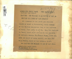 At a session of the joint and combined Chiefs of Staff in Washington 3 members of teh British delegation take up teh business at hand They are L to R Lt Gen Sir Hastings L Ismay Chief staff officer to Minister of Defense, Admiral Sir Dudley Pound First Sea Lord and Chief of Naval Safety and Gen Sir Alan Brooke Chief of Imperial Staff