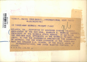 In Three-Man Georgia Primary Fight Atlanta, Ga... Supported by Governor Eugene Talmadge, Arch-enemy of the new deal, Charles D. Redwine (above), President of the Georgia Sate Senate, is battling two pro-new deal opponents in the Georgia Primary today (Sept. 9) for the Democratic Nomination for Governor of Georgia. The two other entrants in the three-man race are speaker E.D. Rivers, of the State House of Representatives, and Judge Blanton Fortson, of Athens.