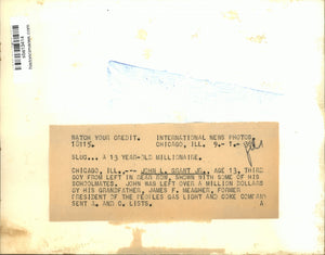 John Grant, Jr, 13, third boy from left in rear row, shown with some of his schoolmates. John was left over a million dollars by his grandfather, James Meagher, former president of the Peoples Gas Light and Coke Company