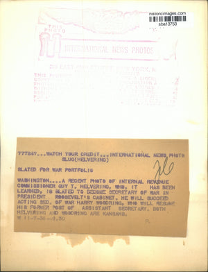 A recent photo of Internal Revenue Commissioner Guy T. Helvering, who, it has been learned, is slated to become Secretary of War in President Roosevelt's Cabinet. He will succeed acting Secretary of War Harry Woodring, who will resume his former post of assistant secretary. Both Helvering and Woodring are Kansas.