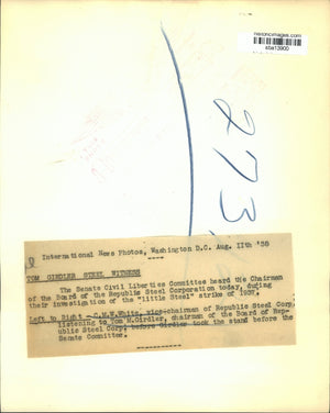 The Senate Civil Liberties Committee heard the Chairman of the Board of the Republic Steel Corporation today during their investigation of the "little steel" strike of 1937. Left to right: C.M.W. White, vice chairman of Republican Steel Corporation listening to Tom Girdler, chairman of the Board of Republic Steel Corporation, before Girdler took the stand before the Senate Committee.