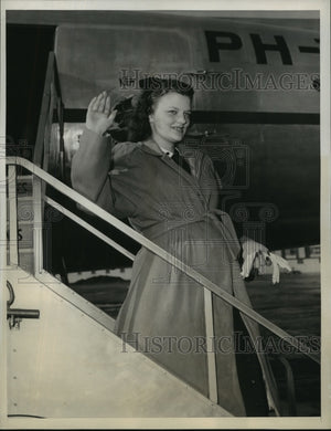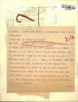 Mrs. Mary Glady Jones of Texas is shown just before she left La Guardia Field aboard K.L.M.Royal Dutch Airline for Germany She is racing the Stork so that she can be with her GI Husband Tech Sgt. Jap L Jones in Erlangen when her fist baby is born. According to Army regulations children under six months of age are not permitted transportation. Hence to rush to have the baby born over there. Should the blesses event occur in the U.S. Mrs. Jones would have to wait six months before going to her husband