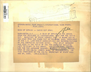 A sign of Spring is the annual draw for pairing in International play for Davis Cup. Secretary of State Cordell Hull is shown making the draw from the famed cuo as Holcombe Ward, president of the U.S. Lawn Tennis Association and Representatives of the competing nations watch, the brief ceremony was held in the patio of the Pan American building. Left to right in the group; Yakichiro Suma, Counselor for the Japanese Embassy; Russell Kingman, Treasurer of the USLA; Joseph Wear of Philadelphia; First Vice President of the USLTA; Secretary of State Hull and Mr. Ward.