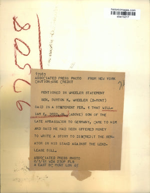 Senator Burton K Wheeler D of Mont said in statement Feb 1 that William E Dodd Jr son of late ambassador to Germany came to him and said he had been offered money to write a story to discredit the Senator in his stand against the lendlease bill
