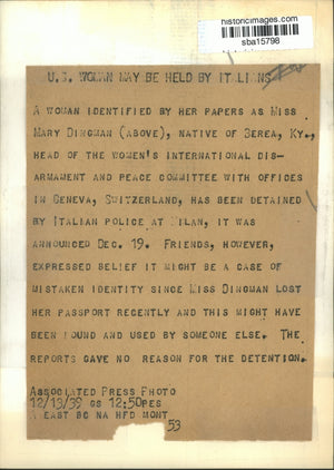 U.S. Woman May Be Held By Italians A woman identified by her papers as Miss Mary Dingman (above), native of Berea, Ky., head of the Women's International Disarmament and Peace Committee with Offices in Geneva, Switzerland, has been detained by Italian Police at Milan, it was announced Dec. 19. Friends, however, expressed belief it might be a case of mistaken identity since MIss Dingman lost her passport recently and this might have been found and used by someone else. The reports gave no reason for the detention.