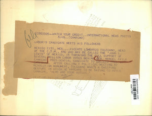 Mexico City Vincente Lombardo Toleando head of the CTM and who may be called th eJohn L Lewis of Mexico is throwing full support of several million labor votes behind Gen Manuel Avila Camachi presidential candidate to succeed Preston Cardena After calling a political meeting at Revolutionary monument Toledano makes sweeping gesture in which he appears to be saying to Avila Camacho Here are your votes