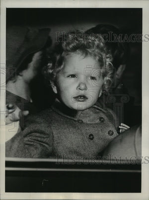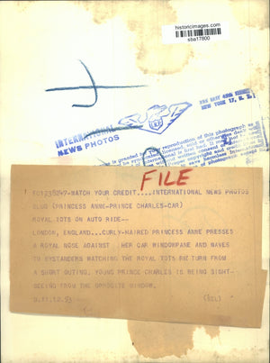 London England Curly haired Princess Anne presses a royal nose against her car windowpane and waves to bystanders watching the royal tots return from a short outing Young Prince Charles is being sightseeing from opposite window