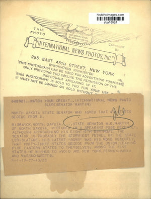 1933 Press Photo State Senator W. E. Martin announces states secede from Union