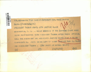 President Truman Chats With Justice Black Washington, L. C. .. While members of the Supreme Court were being photographed with President Truman after their official call the President and associate Justice Black hold a close conversation. Photo shows left to right Justice Hugo L. Black and President Truman.