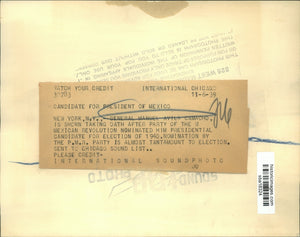 General Manuel Avila Camacho, is shown taking oath after party of the Mexican Revolution nominated him presidential candidate for election of 1940. Nomination by the P.M.R. Party is almost tantamount to election.