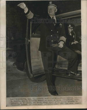 1947 Press Photo Fleet Admiral Chester Nimitz bids farewell to President Truman