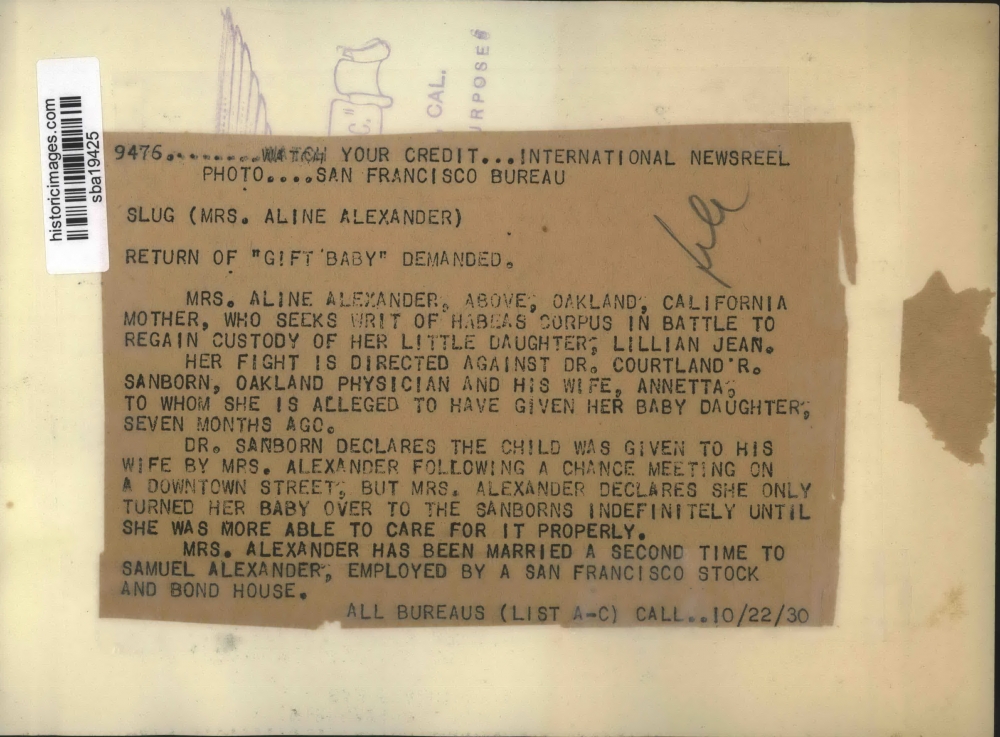Mrs. Aline Alexander, Oakland, California, mother who seeks Writ of Habeas Corpus in Battle to regain custody of her little daughter, Lillian Jean. he