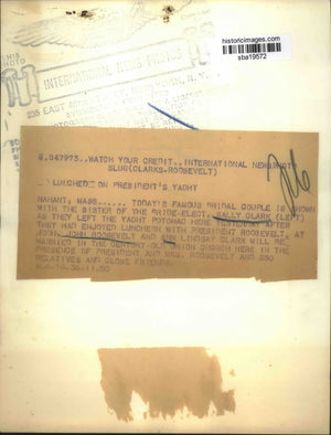 Nahant Mass Today's famous bridal couple is shown with sister of the bride elect Sally Clark at left as they left the yacht Potomac here after they has enjoyed luncheon with President Roosevelt at noon. John Roosevelt and Ann Lindsay Clark will be married in ceremony at century old Union Church here in presence of President and Mrs Roosevelt and 250 relatives and close friends