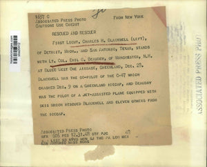 First Lieut Charles H Blackwell left of Detroit MI and San Antonio TX stands with Lt Col Emil G Beaudry of Manchester NH at Bluie West One Airbase Greenland Dec 28. Blackwell was the co-pilot of the C-47 which crashed Dec 9 on an Greenland icecap and Beaudry was the pilot of a jet assisted plane equipped with skis which rescued Blackwell and eleven others from the icecap.