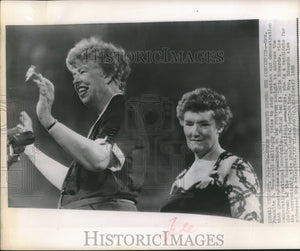 Mrs.Franklin Roosevelt smilingly tries to stop ovation and demonstration that greeted her appearance on the rostrum to address the Democratic Convention behind her in India Edwards Vice Chairman of Democratic National Committee who is a candidate for Convention Vice Presidential nomination. Mrs Edwards also addressed the delegates