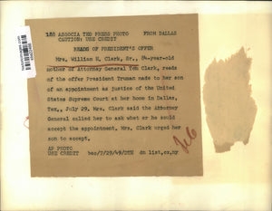Mrs. William H. Clark, Sr., 84 year old mother of Attorney General Tom Clark reads of the offer President Truman made to her son of an appointment as justice of the United States Supreme Court at her home in Dallas, Texas, July 29. Mrs. Clark said the Attorney General called her to ask whether he should accept the appointment. Mrs. Clark urged her son to accept.