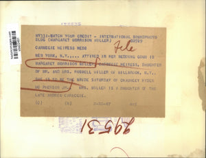 Carnegie Heiress Weds New York, N.Y.,... Attired in her wedding gown is Margaret Morrison Miller, Carnegie heiress, daughter of Mr. and Mrs. Roswell Miller of Millbrook, N.Y., she is to be the bride Saturday of Chauncey Ryder Mc Pherson Jr., Mrs. Miller is a daughter of the late Andrew Carnegie.