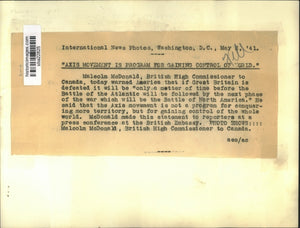Malcolm McDonald British High Commissioner to Canada today warned America that if Great Britain is defeated it will be only a matter of time before the Battle of the Atlantic will be followed bt the next phase of the war which will be Battle of North America He said that the Axis movement is not a program for conquering more territory but for gaining control of the whole world McDonald made this statement to reporters at conference at British Embassy