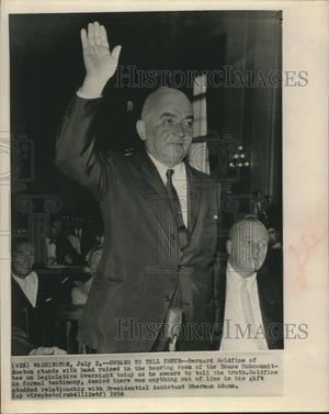 Bernard Goldfine of Boston stands with hand raised in the hearing room of the House Subcommittee in informal testimony denied there was anything out of line in his gift studded relationship with Presidential Assistant Sherman Adams.
