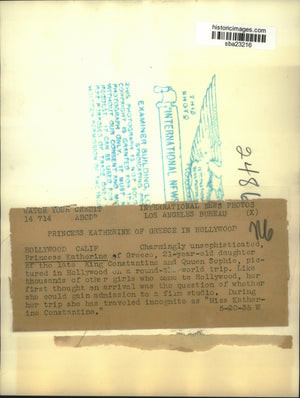 Charmingly unsophisticated Princess Katherine of Greece, 21 year old daughter of the late King Constantine and Queen Sophie, pictured in Hollywood on a round the world trip. Like thousands of other girls who come to Hollywood, her first thought on arrival was the question of whether she could gain admission to a film studio. During her trip she has traveled incognito as "Miss Katherine Constantine."