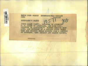 Joyce Allen (L), daughter of Gov O.K. Allen of Louisiana, and Rose Long, daughter of Huey, are shown at a Chicago Hotel where they are staying while looking over a century of progress.