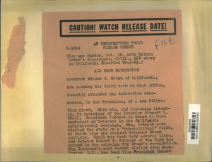 Governor Edmund Brown of California, now seeking his third term in that office, recently attended the dedication ceremonies, in San Francisco, of a new filtration plant. With him and listening intently. is Secretary of the Interior Stewart L. Udall. President Johnson is known to have expressed an interest in the California gubernatorial campaign. Mrs. Johnson also visited the state on a "non political" visit, at which time she praised Governor Brown publicly. Udall has been back several times and Senator Robert F. Kennedy of New York has helped in the campaign for Brown's re election. The Governor's most recent visitor from Washington DC has been Vice President Hubert.