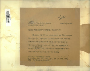 Clement D. Ryan, president of Montgomery Ward & Co., who was barred from his office during government control of the firm's Chicago Properties, enters the company's building in Chicago, may 10, following government return of facilities to the firm.