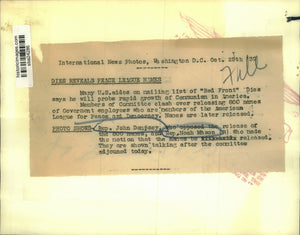 Many U.S.aides on mailing list of "Red Front" -Dies says he will probe rapid Growth of Communism in Inierice. Members of Committee clash over releasing 8OO names of Government employees who are"members- of the American League for Peace and Democracy Names ore later released. Rep John Dempsey who opposed the release of 800 names and Rep Noah Mason (R) who made the motion that the released, They are Shown' talking after the committee adjourned.