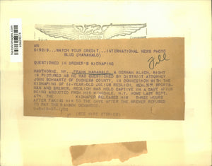 Questioned In Brewer's Kidnaping Hawthorne, NY...Frank Hanawald, a German alien, right is pictured as he was questioned by District Attorney John Schwartz of Duchess county, in connection with the kidnaping of 61-year-old Julius Redlich, wealthy sportsman and brewer. Redlich was held captive in a cave after being abducted from his Wingdale, N.Y. home last Sept. 4th. The kidnaper released him three hours after taking him to the cave after the brewer refused to pay the ransom demanded.